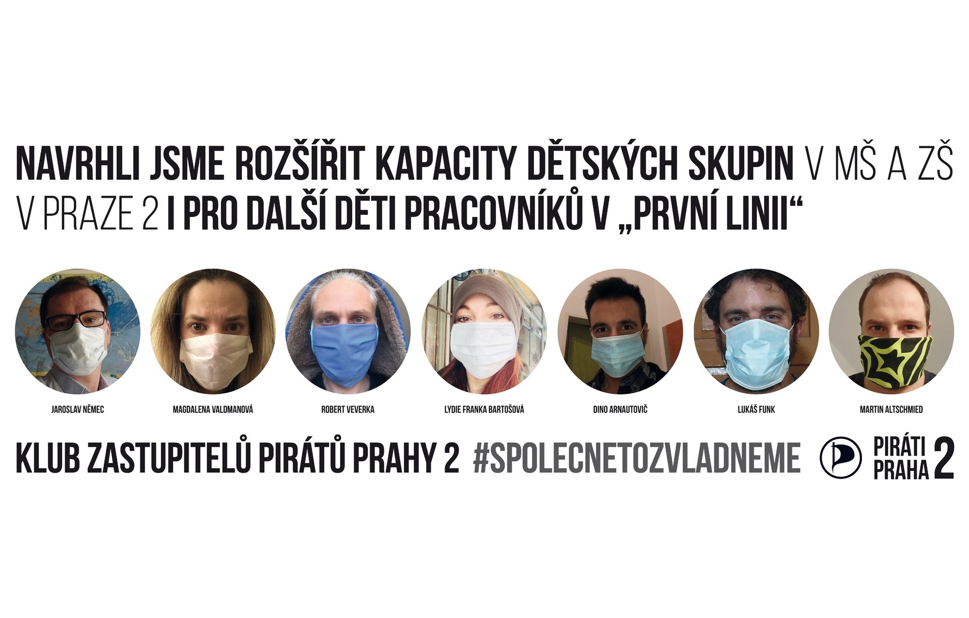Piráti Prahy 2 si v souvislosti s pandemií COVID-19 uvědomují nelehkou situaci mnohých občanů, našich sousedů, kteří musí v těchto ztížených podmínkách být v práci a nemají žádnou možnost hlídání dětí. Praha 2 již 16. 3. na popud žádosti magistrátu vyčlenila dvě mateřské školky a jednu základní školu pro dětské skupiny. Využít je mohou pro své děti ve věku od 3 do 10 let pracovníci integrovaného záchranného systému (IZS), spolupracující s městskou částí Praha 2, zaměstnanci Úřadu městské části a příspěvkových organizací zřizovaným Prahou 2.
