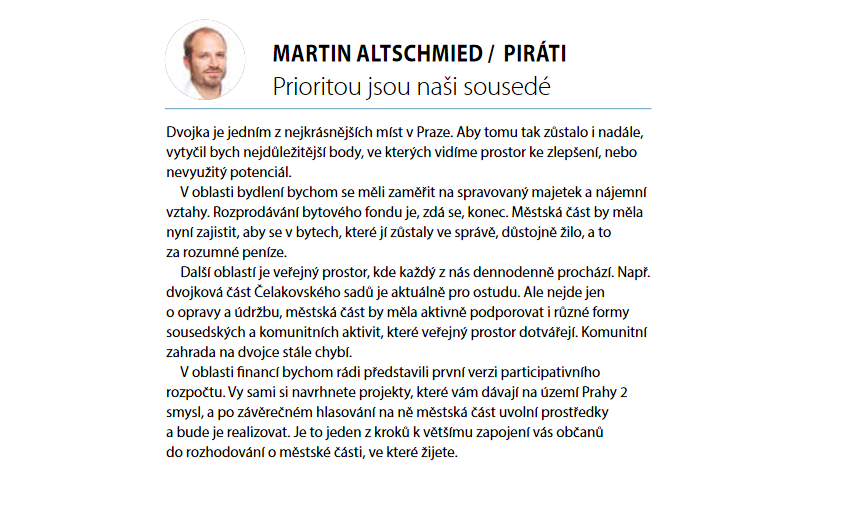 Dvojka je jedním z nejkrásnějších míst v Praze. Aby tomu tak zůstalo i nadále, vytyčil bych nejdůležitější body, ve kterých vidíme prostor ke zlepšení, nebo nevyužitý potenciál.V oblasti bydlení bychom se měli zaměřit na spravovaný majetek a nájemní vztahy. Rozprodávání bytového fondu je, zdá se, konec. Městská část by měla nyní zajistit, aby se v bytech, které jí zůstaly ve správě, důstojně žilo, a to za rozumné peníze.